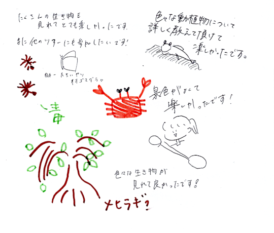 たくさんの生き物を見れてとても楽しかったです。色々な動植物について詳しく教えて頂けて楽しかったです!